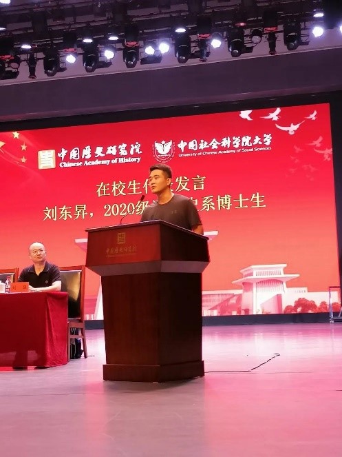 在校生代表2020级近代史系博士生刘东昇同学分享了自己的三点感悟:要不忘初心、牢记目标;做一个主动汲取知识的人,日常中多积累多思考;要保持健康的身心。最后,刘东昇同学向全体同学表达热烈的欢迎,向各位老师致以衷心的祝福。