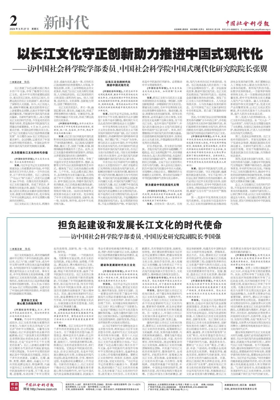 李国强:习近平总书记在文化传承发展座谈会上指出,要坚定文化自信、秉持开放包容、坚持守正创新。这一重要论述科学回答了建设中华民族现代文明必须遵循的基本原则,为新时代长江文化的保护、传承与创新指明了方向。如何建设和发展新时代长江文化?我认为要从以下方面着力:一是坚定不移地以习近平文化思想为旗帜和灵魂;二是努力建构中国自主的长江文化知识体系;三是积极推动长江文化创造性转化、创新性发展;四是主动开展世界大河流域文明对话。