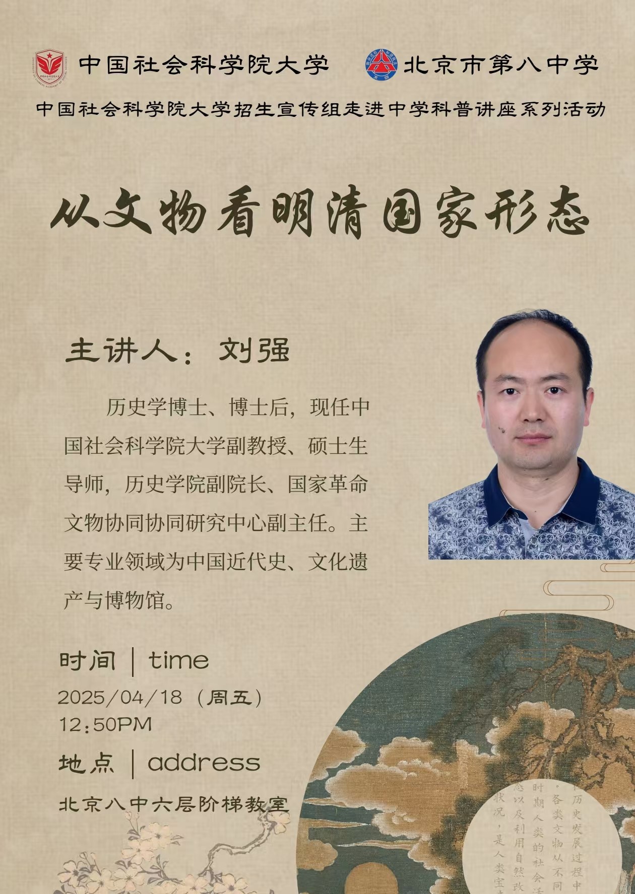 学术讲座环节亮点纷呈。座谈会后,由刘强副教授给高二和部分高三的同学们开展了一场题为“从文物看明清国家形态”专题讲座,本次的讲座现场有近百名师生到会参与,讲座兼具趣味性、科普性和学术性,既有对文物的精妙解读,又有典章制度的深度剖析,在史料实证与理论阐释的有机结合中,展现了历史学的独特魅力。现场学子们表示,这场“听得懂、学得会、用得上”的学术报告,让他们对大学课堂充满向往。这场跨越中学与大学的学术对话,在年轻学子心中播下了求知的火种。