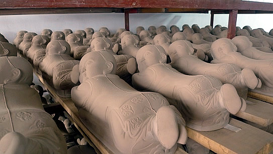 遗址展厅参观结束后,我们走进了仿制定窑瓷器的制瓷工坊。一排排仿定窑孩儿枕整齐地排列在木架之上,这些孩儿枕皆是模制而成,生动可爱,十分逼真。我们站在一旁,仔细观察了制瓷工人的工作,两名女工人正在剔刻孩儿的发髻,一丝一缕,流畅自然,一丝不苟。可见,这些精美的杰作凝聚了制瓷工人诸多的汗水与辛劳。