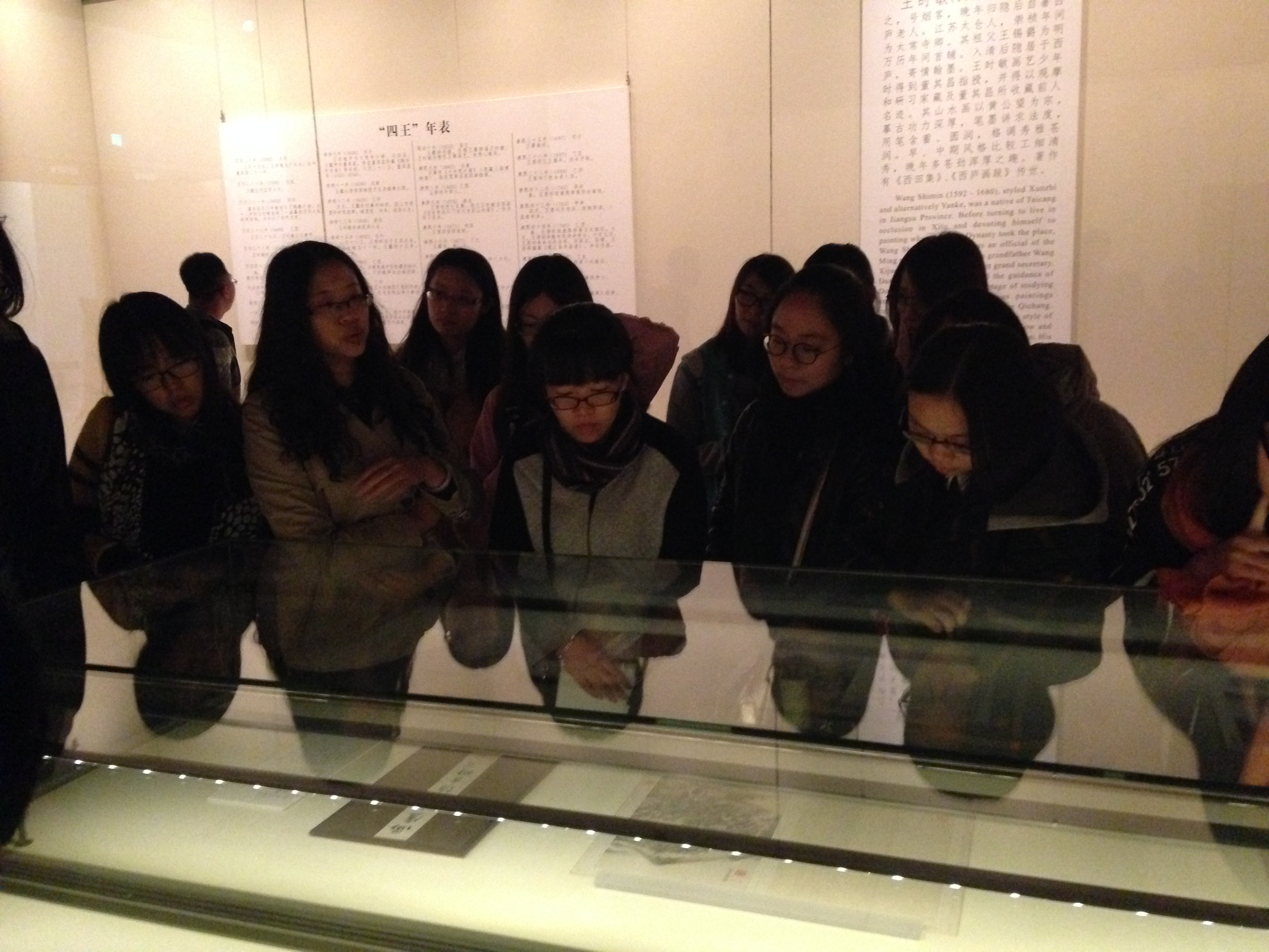 师生一行,亲自给学生们讲解了笔墨真趣——清代四王绘画作品特展、江南双盛——金陵画派、新安画派绘画作品联展及耀世奇珍——馆藏文物精品陈列绘画部分,并精心地安排了本馆专家讲解其他展览:业务部门负责人徐春苓讲解馆藏玉器展览;相关专家学者刘渤在展厅中为文博中心师生讲解陶瓷、文玩等文物。专家们精彩纷呈的讲解激发了同学们认真学习专业的动力,积极的与他们进行交流。