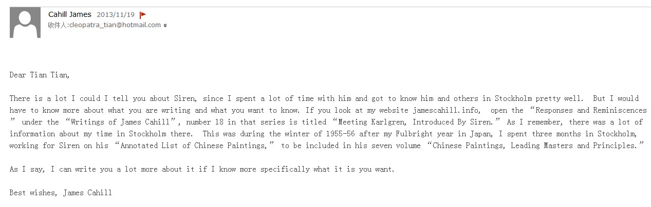 先生曾经担任喜仁龙先生的助理,当我冒昧写信向他求助时,这位中国美术史研究领域的泰斗所给予的热忱支持令我在受宠若惊的同时,更油然而生深深的感动与崇高的敬意。