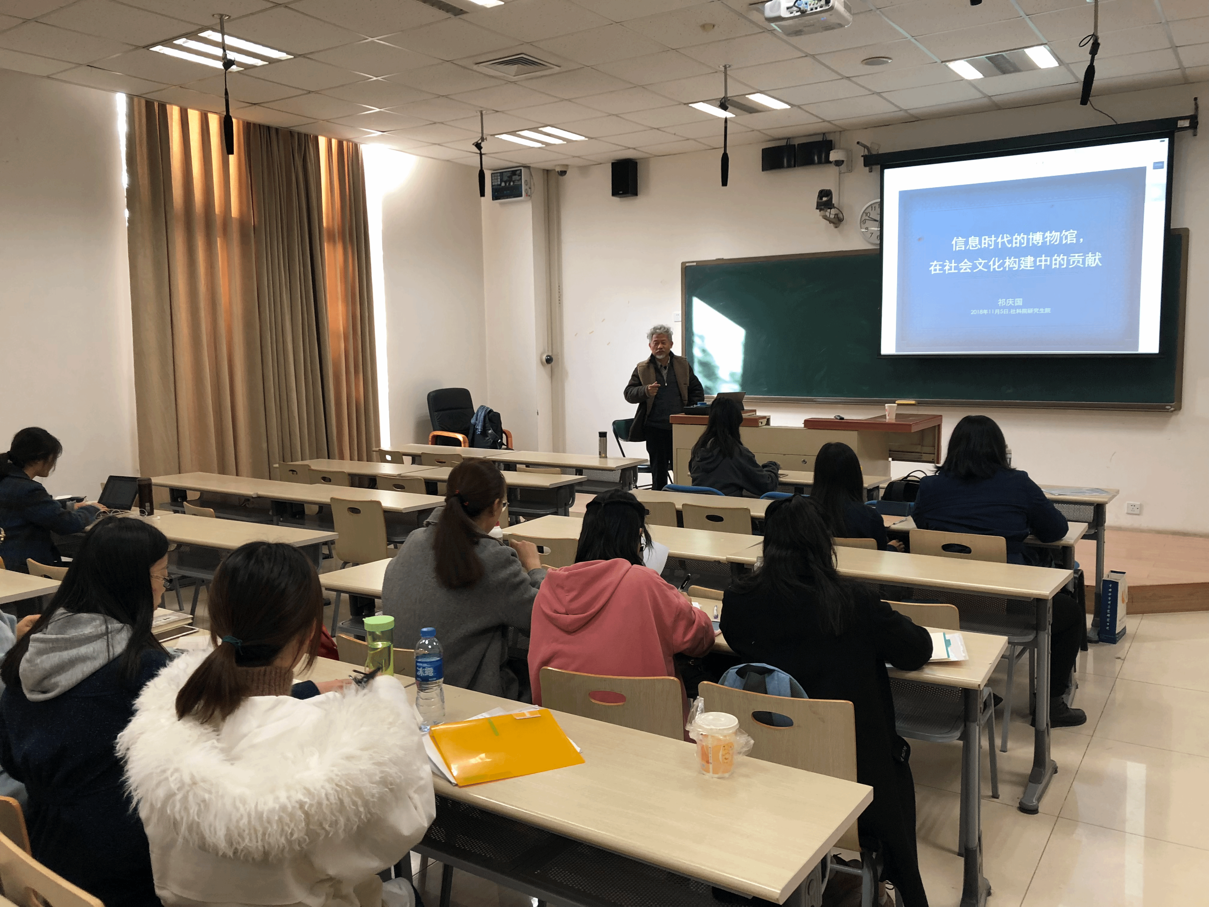 2018年11月5日上午,在研教楼120 教室,北京市文物局的祁庆国老师为文法学院文博专业的学生带来了题为《信息时代的博物馆在社会文化构建中的贡献》的专题讲座。