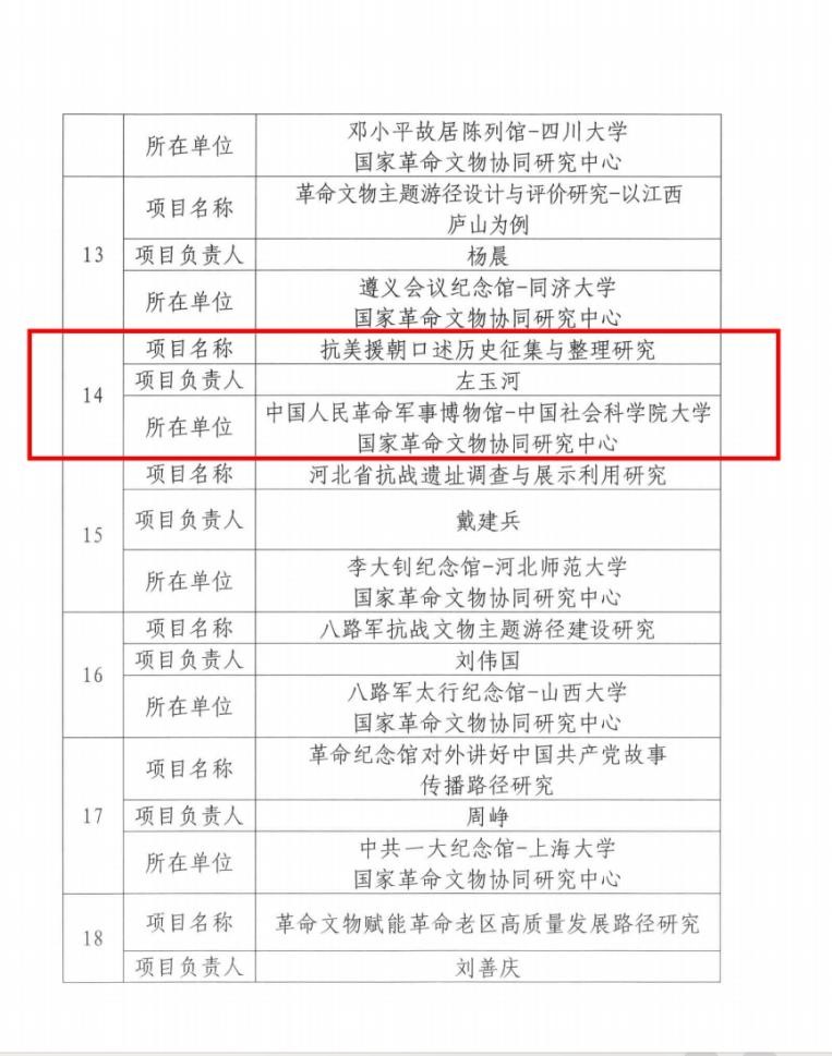 为更好发挥国家革命文物协同研究中心的科研引领作用,同时也为了进一步推动革命文物的系统化研究,20241125日,国家文物局发布了2024年度革命文物研究项目立项名单,由妖精视频 -中国人民革命军事博物馆 国家革命文物协同研究中心申报、我校妖精视频 左玉河教授牵头负责的《抗美援朝口述历史征集与整理》项目荣列其中。